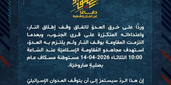 دفاعًا عن لبنان وشعبه، وردًّا على خرق العدوّ لاتفاق وقف إطلاق النار، واعتداءاته المتكرّرة على قرى الجنوب، وبعدما التزمت المقاومة بوقف النار ولم يلتزم به العدوّ، استهدف مجاهدو المُقاومة الإسلاميّة عند السّاعة 10:00 الثلاثاء 14-04-2026 مستوطنة مسكاف عام بصليةٍ صاروخيّة.