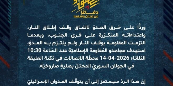 دفاعًا عن لبنان وشعبه، وردًّا على خرق العدوّ لاتفاق وقف إطلاق النار، واعتداءاته المتكرّرة على قرى الجنوب، وبعدما التزمت المقاومة بوقف النار ولم يلتزم به العدوّ، استهدف مجاهدو المُقاومة الإسلاميّة عند السّاعة 10:30 الثلاثاء 14-04-2026 محطّة الاتصالات في ثكنة العليقة في الجولان السوريّ المحتلّ بصليةٍ صاروخيّة.