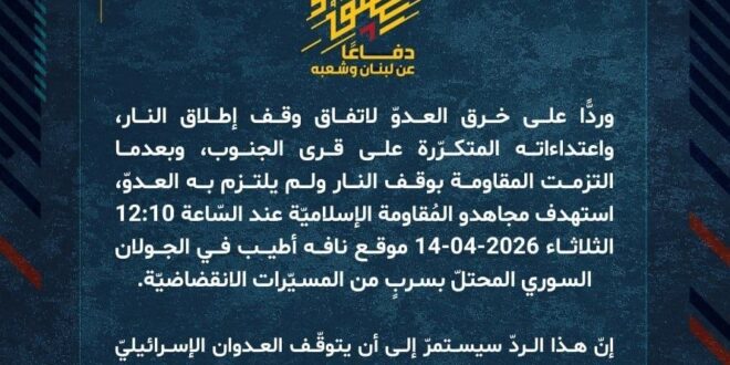 دفاعًا عن لبنان وشعبه، وردًّا على خرق العدوّ لاتفاق وقف إطلاق النار، واعتداءاته المتكرّرة على قرى الجنوب، وبعدما التزمت المقاومة بوقف النار ولم يلتزم به العدوّ، استهدف مجاهدو المُقاومة الإسلاميّة عند السّاعة 12:10 الثلاثاء 14-04-2026 موقع نافه أطيب في الجولان السوري المحتلّ بسربٍ من المسيّرات الانقضاضيّة.