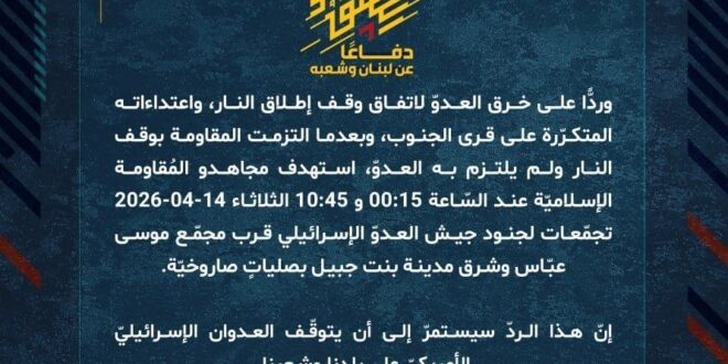 دفاعًا عن لبنان وشعبه، وردًّا على خرق العدوّ لاتفاق وقف إطلاق النار، واعتداءاته المتكرّرة على قرى الجنوب، وبعدما التزمت المقاومة بوقف النار ولم يلتزم به العدوّ، استهدف مجاهدو المُقاومة الإسلاميّة عند السّاعة 00:15 و 10:45 الثلاثاء 14-04-2026 تجمّعات لجنود جيش العدوّ الإسرائيلي قرب مجمّع موسى عبّاس وشرق مدينة بنت جبيل بصلياتٍ صاروخيّة.