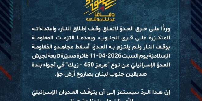دفاعًا عن لبنان وشعبه، وردًّا على خرق العدوّ لاتفاق وقف إطلاق النار، واعتداءاته المتكرّرة على قرى الجنوب، وبعدما التزمت المقاومة بوقف النار ولم يلتزم به العدوّ، أسقط مجاهدو المُقاومة الإسلاميّة يوم السبت 11-04-2026 طائرة مسيّرة تابعة لجيش العدوّ الإسرائيليّ من نوع “هرمز 450 – زیك” في أجواء بلدة صديقين جنوب لبنان بصاروخ أرض جوّ.