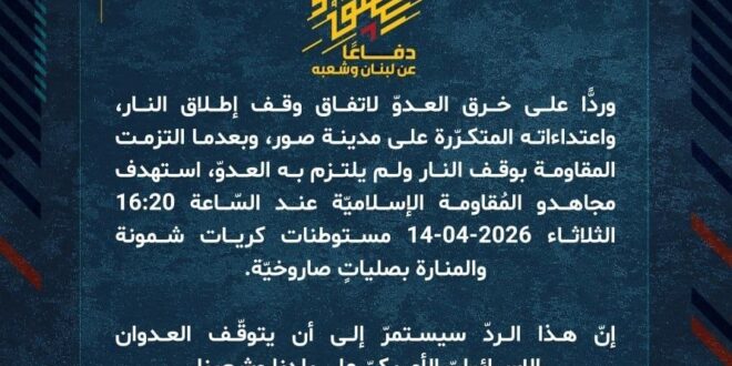 دفاعًا عن لبنان وشعبه، وردًّا على خرق العدوّ لاتفاق وقف إطلاق النار، واعتداءاته المتكرّرة على مدينة صور، وبعدما التزمت المقاومة بوقف النار ولم يلتزم به العدوّ، استهدف مجاهدو المُقاومة الإسلاميّة عند السّاعة 16:20 الثلاثاء 14-04-2026 مستوطنات كريات شمونة والمنارة بصلياتٍ صاروخيّة.