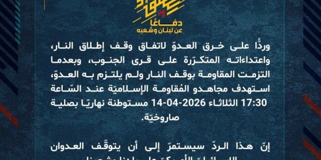 دفاعًا عن لبنان وشعبه، وردًّا على خرق العدوّ لاتفاق وقف إطلاق النار، واعتداءاته المتكرّرة على قرى الجنوب، وبعدما التزمت المقاومة بوقف النار ولم يلتزم به العدوّ، استهدف مجاهدو المُقاومة الإسلاميّة عند السّاعة 17:30 الثلاثاء 14-04-2026 مستوطنة نهاريّا بصلية صاروخيّة.