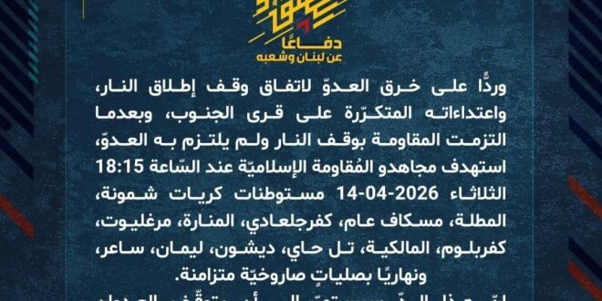 دفاعًا عن لبنان وشعبه، وردًّا على خرق العدوّ لاتفاق وقف إطلاق النار، واعتداءاته المتكرّرة على قرى الجنوب، وبعدما التزمت المقاومة بوقف النار ولم يلتزم به العدوّ، استهدف مجاهدو المُقاومة الإسلاميّة عند السّاعة 18:15 الثلاثاء 14-04-2026 مستوطنات كريات شمونة، المطلة، مسكاف عام، كفرجلعادي، المنارة، مرغليوت، كفربلوم، المالكية، تل حاي، ديشون، ليمان، ساعر، ونهاريًا بصلياتٍ صاروخيّة متزامنة.