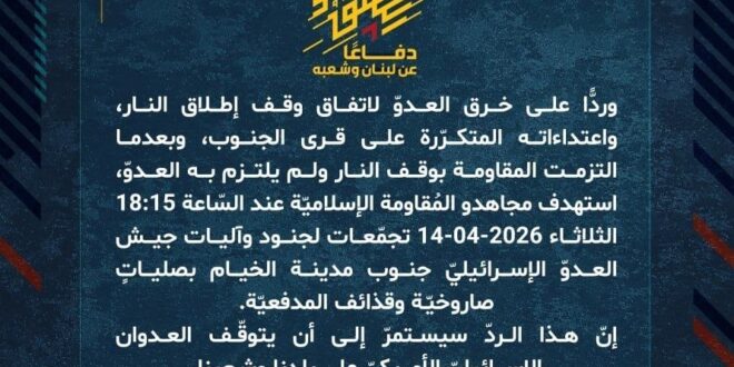 دفاعًا عن لبنان وشعبه، وردًّا على خرق العدوّ لاتفاق وقف إطلاق النار، واعتداءاته المتكرّرة على قرى الجنوب، وبعدما التزمت المقاومة بوقف النار ولم يلتزم به العدوّ، استهدف مجاهدو المُقاومة الإسلاميّة عند السّاعة 18:15 الثلاثاء 14-04-2026 تجمّعات لجنود وآليات جيش العدوّ الإسرائيليّ جنوب مدينة الخيام بصلياتٍ صاروخيّة وقذائف المدفعيّة.