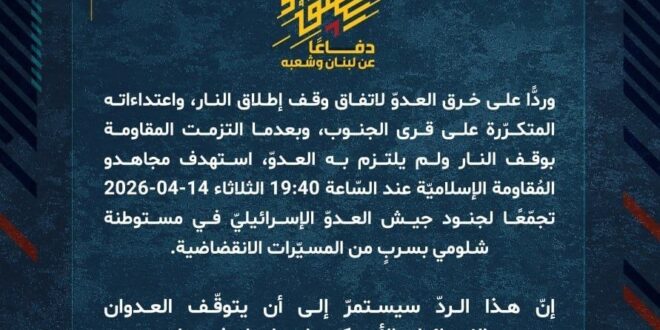 دفاعًا عن لبنان وشعبه، وردًّا على خرق العدوّ لاتفاق وقف إطلاق النار، واعتداءاته المتكرّرة على قرى الجنوب، وبعدما التزمت المقاومة بوقف النار ولم يلتزم به العدوّ، استهدف مجاهدو المُقاومة الإسلاميّة عند السّاعة 19:40 الثلاثاء 14-04-2026 تجمّعًا لجنود جيش العدوّ الإسرائيليّ في مستوطنة شلومي بسربٍ من المسيّرات الانقضاضية.