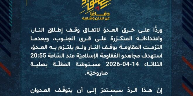 دفاعًا عن لبنان وشعبه، وردًّا على خرق العدوّ لاتفاق وقف إطلاق النار، واعتداءاته المتكرّرة على قرى الجنوب، وبعدما التزمت المقاومة بوقف النار ولم يلتزم به العدوّ، استهدف مجاهدو المُقاومة الإسلاميّة عند السّاعة 20:55 الثلاثاء 14-04-2026 مستوطنة المطلّة بصلية صاروخيّة.