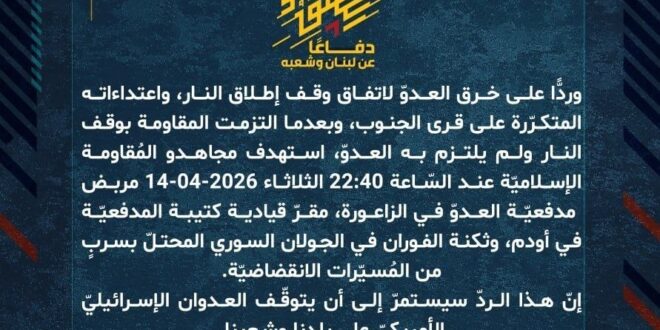 دفاعًا عن لبنان وشعبه، وردًّا على خرق العدوّ لاتفاق وقف إطلاق النار، واعتداءاته المتكرّرة على قرى الجنوب، وبعدما التزمت المقاومة بوقف النار ولم يلتزم به العدوّ، استهدف مجاهدو المُقاومة الإسلاميّة عند السّاعة 22:40 الثلاثاء 14-04-2026 مربض مدفعيّة العدوّ في الزاعورة، مقرّ قيادية كتيبة المدفعيّة في أودم، وثكنة الفوران في الجولان السوري المحتلّ بسربٍ من المُسيّرات الانقضاضيّة.
