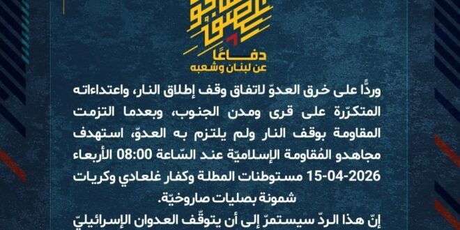 دفاعًا عن لبنان وشعبه، وردًّا على خرق العدوّ لاتفاق وقف إطلاق النار، واعتداءاته المتكرّرة على قرى ومدن الجنوب، وبعدما التزمت المقاومة بوقف النار ولم يلتزم به العدوّ، استهدف مجاهدو المُقاومة الإسلاميّة عند السّاعة 08:00 الأربعاء 15-04-2026 مستوطنات المطلة وكفار جلعادي وكريات شمونة بصليات صاروخيّة.