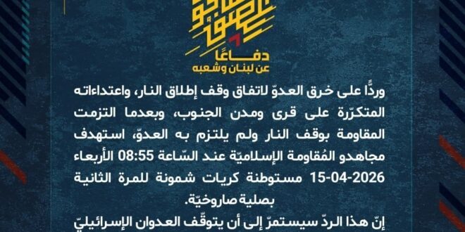 دفاعًا عن لبنان وشعبه، وردًّا على خرق العدوّ لاتفاق وقف إطلاق النار، واعتداءاته المتكرّرة على قرى ومدن الجنوب، وبعدما التزمت المقاومة بوقف النار ولم يلتزم به العدوّ، استهدف مجاهدو المُقاومة الإسلاميّة عند السّاعة 08:55 الأربعاء 15-04-2026 مستوطنة كريات شمونة للمرة الثانية بصلية صاروخيّة.