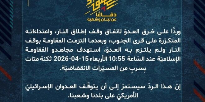 دفاعًا عن لبنان وشعبه، وردًّا على خرق العدوّ لاتفاق وقف إطلاق النار، واعتداءاته المتكرّرة على قرى الجنوب، وبعدما التزمت المقاومة بوقف النار ولم يلتزم به العدوّ، استهدف مجاهدو المُقاومة الإسلاميّة عند السّاعة 10:55 الأربعاء 15-04-2026 ثكنة متات بِسربٍ من المسيّرات الانقضاضيّة.