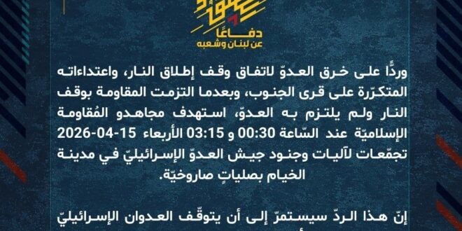 دفاعًا عن لبنان وشعبه، وردًّا على خرق العدوّ لاتفاق وقف إطلاق النار، واعتداءاته المتكرّرة على قرى الجنوب، وبعدما التزمت المقاومة بوقف النار ولم يلتزم به العدوّ، استهدف مجاهدو المُقاومة الإسلاميّة عند السّاعة 00:30 و 03:15 الأربعاء 15-04-2026 تجمّعات لآليات وجنود جيش العدوّ الإسرائيليّ في مدينة الخيام بصلياتٍ صاروخيّة.
