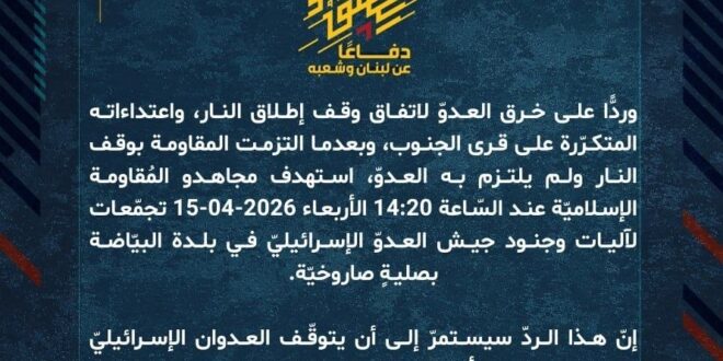 دفاعًا عن لبنان وشعبه، وردًّا على خرق العدوّ لاتفاق وقف إطلاق النار، واعتداءاته المتكرّرة على قرى الجنوب، وبعدما التزمت المقاومة بوقف النار ولم يلتزم به العدوّ، استهدف مجاهدو المُقاومة الإسلاميّة عند السّاعة 14:20 الأربعاء 15-04-2026 تجمّعات لآليات وجنود جيش العدوّ الإسرائيليّ في بلدة البيّاضة بصليةٍ صاروخيّة.