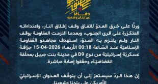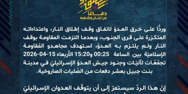 دفاعًا عن لبنان وشعبه، وردًّا على خرق العدوّ لاتفاق وقف إطلاق النار، واعتداءاته المتكرّرة على قرى الجنوب، وبعدما التزمت المقاومة بوقف النار ولم يلتزم به العدوّ، استهدف مجاهدو المُقاومة الإسلاميّة بين الساعة 00:25 و15:20 الأربعاء 15-04-2026 تجمّعًات لآليّات وجنود جيش العدوّ الإسرائيليّ في مدينة بنت جبيل بعشر دفعات من الصّليات الصاروخية.