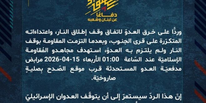 دفاعًا عن لبنان وشعبه، وردًّا على خرق العدوّ لاتفاق وقف إطلاق النار، واعتداءاته المتكرّرة على قرى الجنوب، وبعدما التزمت المقاومة بوقف النار ولم يلتزم به العدوّ، استهدف مجاهدو المُقاومة الإسلاميّة عند السّاعة 01:00 الأربعاء 15-04-2026 مرابض مدفعيّة العدو المستحدثة قرب موقع الصّدح بِصليةٍ صاروخيّة.