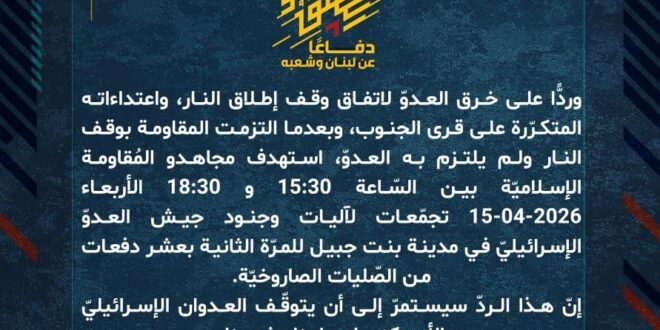 دفاعًا عن لبنان وشعبه، وردًّا على خرق العدوّ لاتفاق وقف إطلاق النار، واعتداءاته المتكرّرة على قرى الجنوب، وبعدما التزمت المقاومة بوقف النار ولم يلتزم به العدوّ، استهدف مجاهدو المُقاومة الإسلاميّة بين السّاعة 15:30 و 18:30 الأربعاء 15-04-2026 تجمّعات لآليات وجنود جيش العدوّ الإسرائيليّ في مدينة بنت جبيل للمرّة الثانية بعشر دفعات من الصّليات الصاروخيّة.