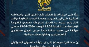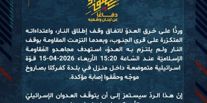 دفاعًا عن لبنان وشعبه، وردًّا على خرق العدوّ لاتفاق وقف إطلاق النار، واعتداءاته المتكرّرة على قرى الجنوب، وبعدما التزمت المقاومة بوقف النار ولم يلتزم به العدوّ، استهدف مجاهدو المُقاومة الإسلاميّة عند السّاعة 15:20 الأربعاء 15-04-2026 قوّة اسرائيلية متموضعة داخل منزل في بلدة كفركلا بصاروخ موجّه وحقّقوا إصابة مؤكدة.