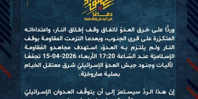 دفاعًا عن لبنان وشعبه، وردًّا على خرق العدوّ لاتفاق وقف إطلاق النار، واعتداءاته المتكرّرة على قرى الجنوب، وبعدما التزمت المقاومة بوقف النار ولم يلتزم به العدوّ، استهدف مجاهدو المُقاومة الإسلاميّة عند السّاعة 17:20 الأربعاء 15-04-2026 تجمّعًا لآليات وجنود جيش العدوّ الإسرائيليّ شرق معتقل الخيام بصلية صاروخيّة.