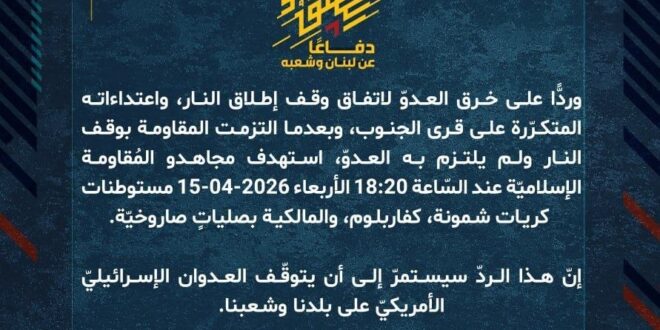 دفاعًا عن لبنان وشعبه، وردًّا على خرق العدوّ لاتفاق وقف إطلاق النار، واعتداءاته المتكرّرة على قرى الجنوب، وبعدما التزمت المقاومة بوقف النار ولم يلتزم به العدوّ، استهدف مجاهدو المُقاومة الإسلاميّة عند السّاعة 18:20 الأربعاء 15-04-2026 مستوطنات كريات شمونة، كفاربلوم، والمالكية بصلياتٍ صاروخيّة.