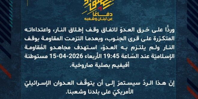 دفاعًا عن لبنان وشعبه، وردًّا على خرق العدوّ لاتفاق وقف إطلاق النار، واعتداءاته المتكرّرة على قرى الجنوب، وبعدما التزمت المقاومة بوقف النار ولم يلتزم به العدوّ، استهدف مجاهدو المُقاومة الإسلاميّة عند السّاعة 19:45 الأربعاء 15-04-2026 مستوطنة أفيفيم بصلية صاروخية.