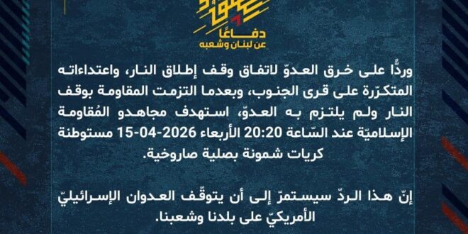 دفاعًا عن لبنان وشعبه، وردًّا على خرق العدوّ لاتفاق وقف إطلاق النار، واعتداءاته المتكرّرة على قرى الجنوب، وبعدما التزمت المقاومة بوقف النار ولم يلتزم به العدوّ، استهدف مجاهدو المُقاومة الإسلاميّة عند السّاعة 20:20 الأربعاء 15-04-2026 مستوطنة كريات شمونة بصلية صاروخية.