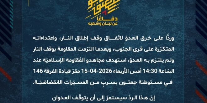دفاعًا عن لبنان وشعبه، وردًّا على خرق العدوّ لاتّفاق وقف إطلاق النار، واعتداءاته المتكرّرة على قرى الجنوب، وبعدما التزمت المقاومة بوقف النار ولم يلتزم به العدوّ، استهدف مجاهدو المُقاومة الإسلاميّة عند السّاعة 14:30 أمس الأربعاء 15-04-2026 مقر قيادة الفرقة 146 في مستوطنة جعتون بسربٍ من المسيّرات الانقضاضيّة.