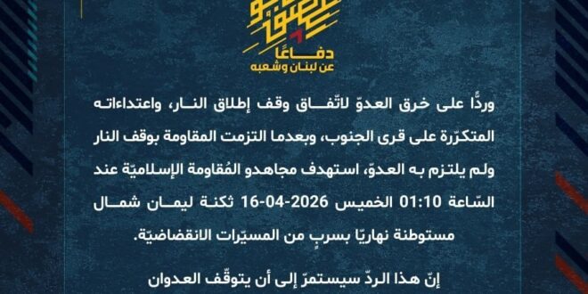 دفاعًا عن لبنان وشعبه، وردًّا على خرق العدوّ لاتفاق وقف إطلاق النار، واعتداءاته المتكرّرة على قرى الجنوب، وبعدما التزمت المقاومة بوقف النار ولم يلتزم به العدوّ، استهدف مجاهدو المُقاومة الإسلاميّة عند السّاعة 01:10 الخميس 16-04-2026 ثكنة ليمان شمال مستوطنة نهاريّا بسربٍ من المسيّرات الانقضاضيّة.