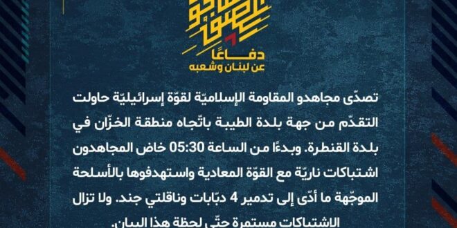 دفاعًا عن لبنان وشعبه، تصدّى مجاهدو المقاومة الإسلاميّة لقوّة إسرائيليّة حاولت التقدّم من جهة بلدة الطيبة باتّجاه منطقة الخزّان في بلدة القنطرة. وبدءًا من الساعة 05:30 خاض المجاهدون اشتباكات ناريّة مع القوّة المعادية واستهدفوها بالأسلحة الموجّهة ما أدّى إلى تدمير 4 دبّابات وناقلتي جند. ولا تزال الاشتباكات مستمرة حتّى لحظة هذا البيان.