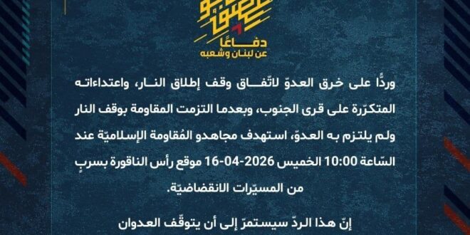 دفاعًا عن لبنان وشعبه، وردًّا على خرق العدوّ لاتفاق وقف إطلاق النار، واعتداءاته المتكرّرة على قرى ومدن الجنوب، وبعدما التزمت المقاومة بوقف النار ولم يلتزم به العدوّ، استهدف مجاهدو المُقاومة الإسلاميّة عند السّاعة 10:00 الخميس 16-04-2026 موقع رأس الناقورة بسربٍ من المسيّرات الانقضاضيّة.