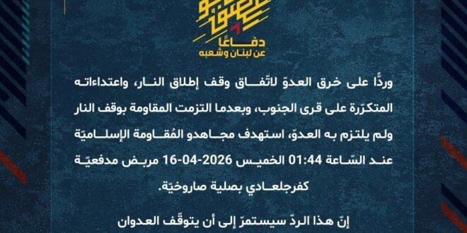 دفاعًا عن لبنان وشعبه، وردًّا على خرق العدوّ لاتفاق وقف إطلاق النار، واعتداءاته المتكرّرة على قرى ومدن الجنوب، وبعدما التزمت المقاومة بوقف النار ولم يلتزم به العدوّ، استهدف مجاهدو المُقاومة الإسلاميّة عند السّاعة 01:44 الخميس 16-04-2026 مربض مدفعيّة كفرجلعادي بصلية صاروخيّة.