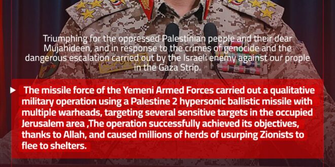 نفذتِ القوَّةُ الصاروخيَّةُ في القوّاتِ المسلَّحةِ اليمنيَّةِ عمليَّةً عسكريَّةً نوعيَّةً وذلكَ بصاروخٍ باليستيٍّ فَرْطِ صوتيٍّ نوعِ فلسطين2 الانشطاريِّ متعددِ الرؤوسِ مستهدفاً أهدافًا حساسةً عدةً، في منطقةِ القدس المحتلةِ، وقد حقَّقتِ العمليَّةُ أهدافَها بنجاحٍ بفضلِ اللهِ، وتسبَّبتْ في هُروبِ الملايينِ من قطعانِ الصهاينةِ الغاصبينَ إلى الملاجئِ.