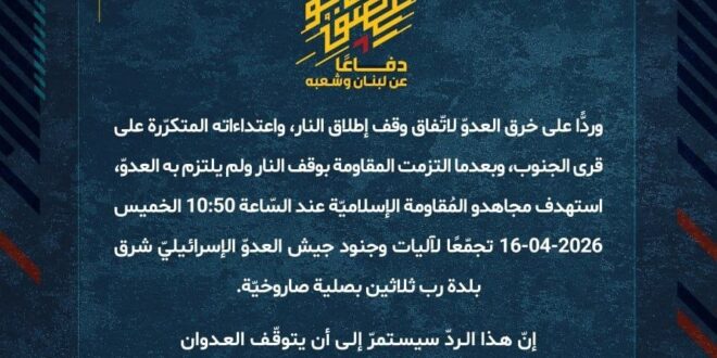 دفاعًا عن لبنان وشعبه، وردًّا على خرق العدوّ لاتفاق وقف إطلاق النار، واعتداءاته المتكرّرة على قرى ومدن الجنوب، وبعدما التزمت المقاومة بوقف النار ولم يلتزم به العدوّ، استهدف مجاهدو المُقاومة الإسلاميّة عند السّاعة 10:50 الخميس 16-04-2026 تجمّعًا لآليات وجنود جيش العدوّ الإسرائيليّ شرق بلدة رب ثلاثين بصلية صاروخيّة.