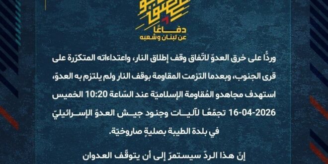دفاعًا عن لبنان وشعبه، وردًّا على خرق العدوّ لاتفاق وقف إطلاق النار، واعتداءاته المتكرّرة على قرى ومدن الجنوب، وبعدما التزمت المقاومة بوقف النار ولم يلتزم به العدوّ، استهدف مجاهدو المُقاومة الإسلاميّة عند السّاعة 10:20 الخميس 16-04-2026 تجمّعًا لآليات وجنود جيش العدوّ الإسرائيليّ في بلدة الطيبة بصليةٍ صاروخيّة.