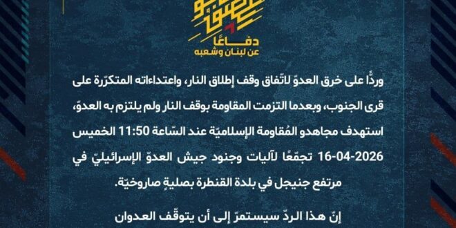 دفاعًا عن لبنان وشعبه، وردًّا على خرق العدوّ لاتفاق وقف إطلاق النار، واعتداءاته المتكرّرة على قرى ومدن الجنوب، وبعدما التزمت المقاومة بوقف النار ولم يلتزم به العدوّ، استهدف مجاهدو المُقاومة الإسلاميّة عند السّاعة 11:50 الخميس 16-04-2026 تجمّعًا لآليات وجنود جيش العدوّ الإسرائيليّ في مرتفع جنيجل في بلدة القنطرة بصليةٍ صاروخيّة.