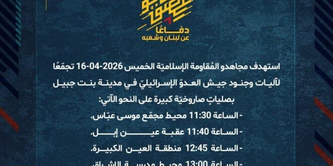 دفاعًا عن لبنان وشعبه، استهدف مجاهدو المُقاومة الإسلاميّة الخميس 16-04-2026 تجمّعًا لآليات وجنود جيش العدوّ الإسرائيليّ في مدينة بنت جبيل بصلياتٍ صاروخيّة كبيرة على النحو الآتي: