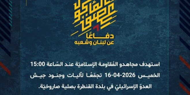 دفاعًا عن لبنان وشعبه، استهدف مجاهدو المُقاومة الإسلاميّة عند السّاعة 15:00 الخميس 16-04-2026 تجمّعًا لآليات وجنود جيش العدوّ الإسرائيليّ في بلدة القنطرة بصلية صاروخيّة.