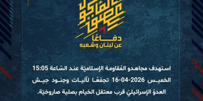 دفاعًا عن لبنان وشعبه، استهدف مجاهدو المُقاومة الإسلاميّة عند السّاعة 15:05 الخميس 16-04-2026 تجمّعًا لآليات وجنود جيش العدوّ الإسرائيليّ قرب معتقل الخيام بصلية صاروخيّة.
