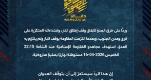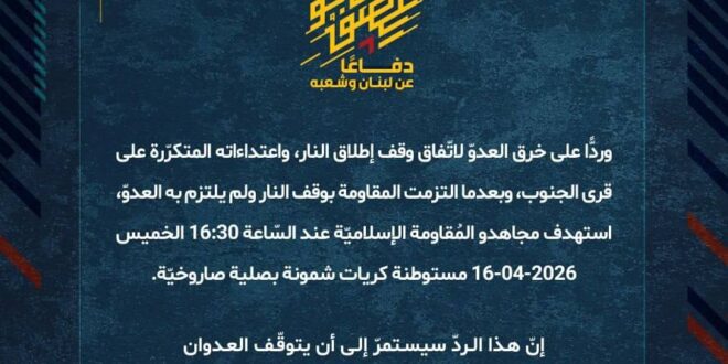 دفاعًا عن لبنان وشعبه، وردًّا على خرق العدوّ لاتفاق وقف إطلاق النار، واعتداءاته المتكرّرة على قرى ومدن الجنوب، وبعدما التزمت المقاومة بوقف النار ولم يلتزم به العدوّ، استهدف مجاهدو المُقاومة الإسلاميّة عند السّاعة 16:30 الخميس 16-04-2026 مستوطنة كريات شمونة بصلية صاروخيّة.