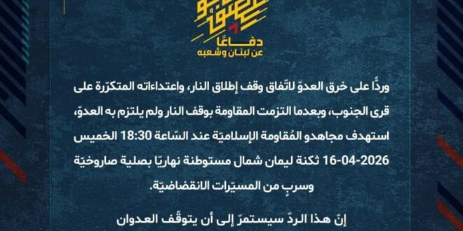 دفاعًا عن لبنان وشعبه، وردًّا على خرق العدوّ لاتفاق وقف إطلاق النار، واعتداءاته المتكرّرة على قرى ومدن الجنوب، وبعدما التزمت المقاومة بوقف النار ولم يلتزم به العدوّ، استهدف مجاهدو المُقاومة الإسلاميّة عند السّاعة 18:30 الخميس 16-04-2026 ثكنة ليمان شمال مستوطنة نهاريّا بصلية صاروخيّة وسربٍ من المسيّرات الانقضاضيّة.