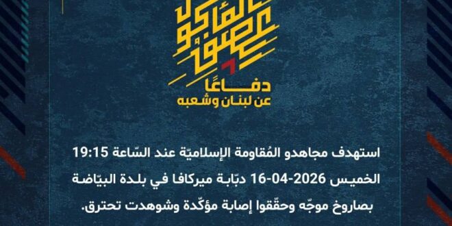 دفاعًا عن لبنان وشعبه، استهدف مجاهدو المُقاومة الإسلاميّة عند السّاعة 19:15 الخميس 16-04-2026 دبّابة ميركافا في بلدة البيّاضة بصاروخ موجّه وحقّقوا إصابة مؤكّدة وشوهدت تحترق.