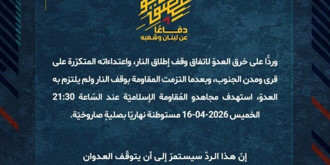 دفاعًا عن لبنان وشعبه، وردًّا على خرق العدوّ لاتفاق وقف إطلاق النار، واعتداءاته المتكرّرة على قرى ومدن الجنوب، وبعدما التزمت المقاومة بوقف النار ولم يلتزم به العدوّ، استهدف مجاهدو المُقاومة الإسلاميّة عند السّاعة 21:30 الخميس 16-04-2026 مستوطنة نهاريّا بصليةٍ صاروخيّة.