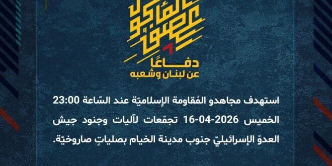 دفاعًا عن لبنان وشعبه، استهدف مجاهدو المُقاومة الإسلاميّة عند السّاعة 23:00 الخميس 16-04-2026 تجمّعات لآليات وجنود جيش العدوّ الإسرائيليّ جنوب مدينة الخيام بصليةٍ صاروخيّة.