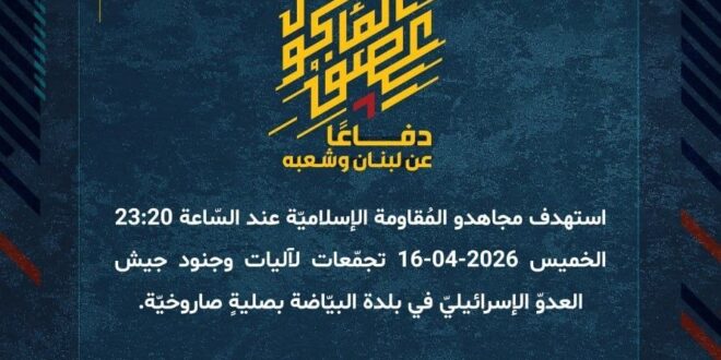 دفاعًا عن لبنان وشعبه، استهدف مجاهدو المُقاومة الإسلاميّة عند السّاعة 23:20 الخميس 16-04-2026 تجمّعات لآليات وجنود جيش العدوّ الإسرائيليّ في بلدة البيّاضة بصليةٍ صاروخيّة.