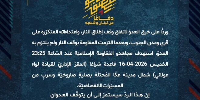 دفاعًا عن لبنان وشعبه، وردًّا على خرق العدوّ لاتفاق وقف إطلاق النار، واعتداءاته المتكرّرة على قرى ومدن الجنوب، وبعدما التزمت المقاومة بوقف النار ولم يلتزم به العدوّ، استهدف مجاهدو المُقاومة الإسلاميّة عند السّاعة 23:25 الخميس 16-04-2026 قاعدة شراغا (المقرّ الإداريّ لقيادة لواء غولاني) شمال مدينة عكّا المُحتلّة بصليةٍ صاروخيّة وسربٍ من المسيّرات الانقضاضيّة.