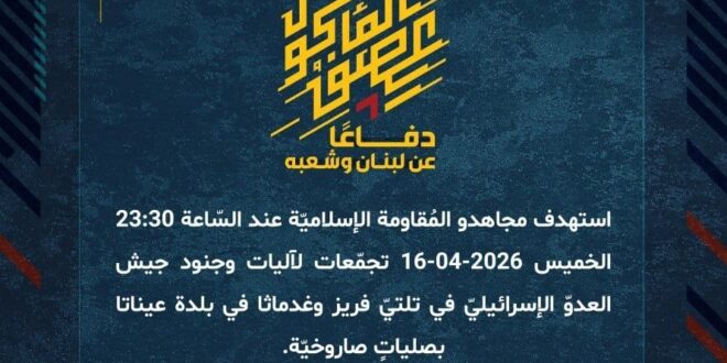 دفاعًا عن لبنان وشعبه، استهدف مجاهدو المُقاومة الإسلاميّة عند السّاعة 23:30 الخميس 16-04-2026 تجمّعات لآليات وجنود جيش العدوّ الإسرائيليّ في تلتيّ فريز وغدماثا في بلدة عيناتا بصلياتٍ صاروخيّة.