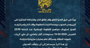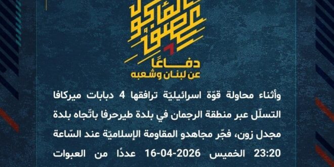 دفاعًا عن لبنان وشعبه، وأثناء محاولة قوّة اسرائيليّة ترافقها 4 دبابات ميركافا التسلّل عبر منطقة الرجمان في بلدة طيرحرفا باتّجاه بلدة مجدل زون، فجّر مجاهدو المقاومة الإسلاميّة عند السّاعة 23:20 الخميس 16-04-2026 عددًا من العبوات الناسفة بالقوّة، وحقّقوا إصابات مباشرة.
