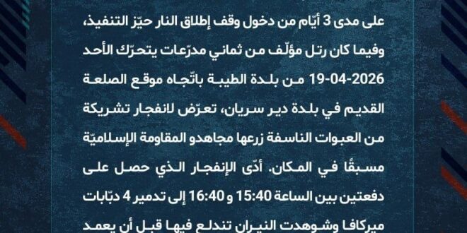 أثناء ممارسة قوّات الإحتلال الإسرائيليّة خرقًا جديدًا يضاف إلى سلسلة خروقاتها الفاضحة والموثّقة على مدى 3 أيّام من دخول وقف إطلاق النار حيّز التنفيذ، وفيما كان رتل مؤلّف من ثماني مدرّعات يتحرّك الأحد 19-04-2026 من بلدة الطيبة باتّجاه موقع الصلعة القديم في بلدة دير سريان، تعرّض لانفجار تشريكة من العبوات الناسفة زرعها مجاهدو المقاومة الإسلاميّة مسبقًا في المكان. أدّى الإنفجار الذي حصل على دفعتين بين الساعة 15:40 و 16:40 إلى تدمير 4 دبّابات ميركافا وشوهدت النيران تندلع فيها قبل أن يعمد العدوّ عند الساعة 18:00 إلى سحبها من مكان الحدث.