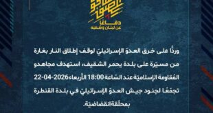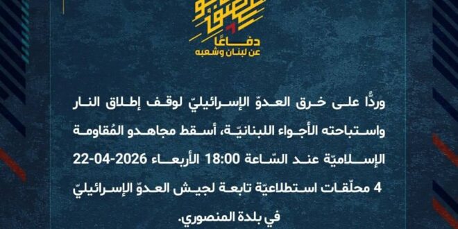 دفاعًا عن لبنان وشعبه، وردًّا على خرق العدوّ الإسرائيليّ لوقف إطلاق النار واستباحته الأجواء اللبنانيّة، أسقط مجاهدو المُقاومة الإسلاميّة عند السّاعة 18:00 الأربعاء 22-04-2026 4 محلّقات استطلاعيّة تابعة لجيش العدوّ الإسرائيليّ في بلدة المنصوري.