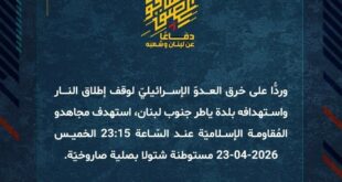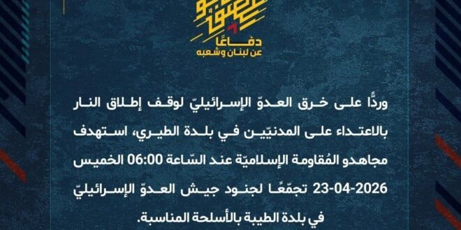 دفاعًا عن لبنان وشعبه، وردًّا على خرق العدوّ الإسرائيليّ لوقف إطلاق النار بالاعتداء على المدنيّين في بلدة الطيري، استهدف مجاهدو المُقاومة الإسلاميّة عند السّاعة 06:00 الخميس 23-04-2026 تجمّعًا لجنود جيش العدوّ الإسرائيليّ في بلدة الطيبة بالأسلحة المناسبة.