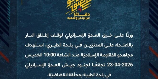 دفاعًا عن لبنان وشعبه، وردًّا على خرق العدوّ الإسرائيليّ لوقف إطلاق النار بالاعتداء على المدنيّين في بلدة الطيري، استهدف مجاهدو المُقاومة الإسلاميّة عند السّاعة 10:00 الخميس 23-04-2026 تجمّعًا لجنود جيش العدوّ الإسرائيليّ في بلدة الطيبة بمحلّقة انقضاضيّة.